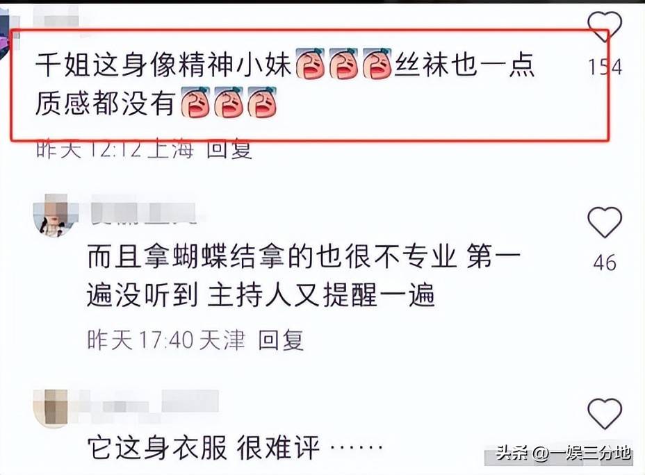 该说不说的,透露出一股轻浮的感觉,把她原本的气质都给盖过了,还被网友说是精神小妹,一身衣服很难评。