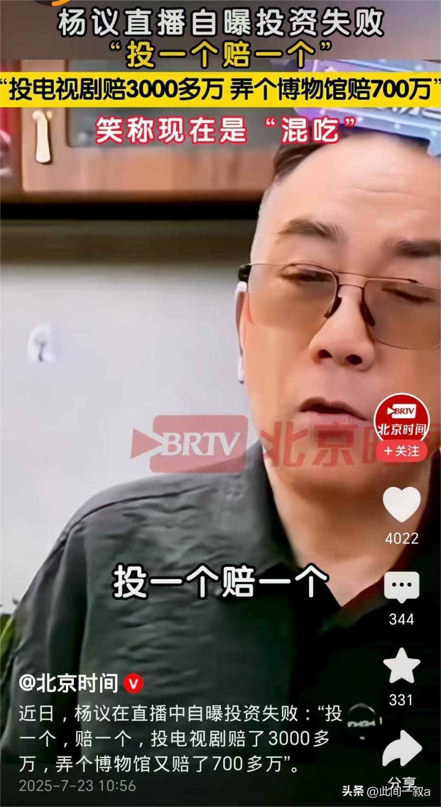 北京时间:2025年7月23日《近日,杨议在直播中自曝投资失败:“投一个,赔一个,投电视剧赔了3000多万,弄个博物馆又赔了700多万”。》