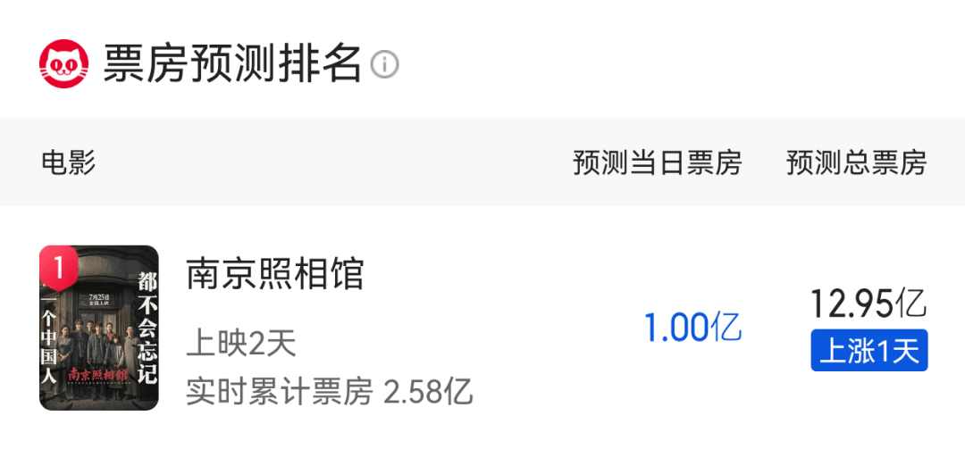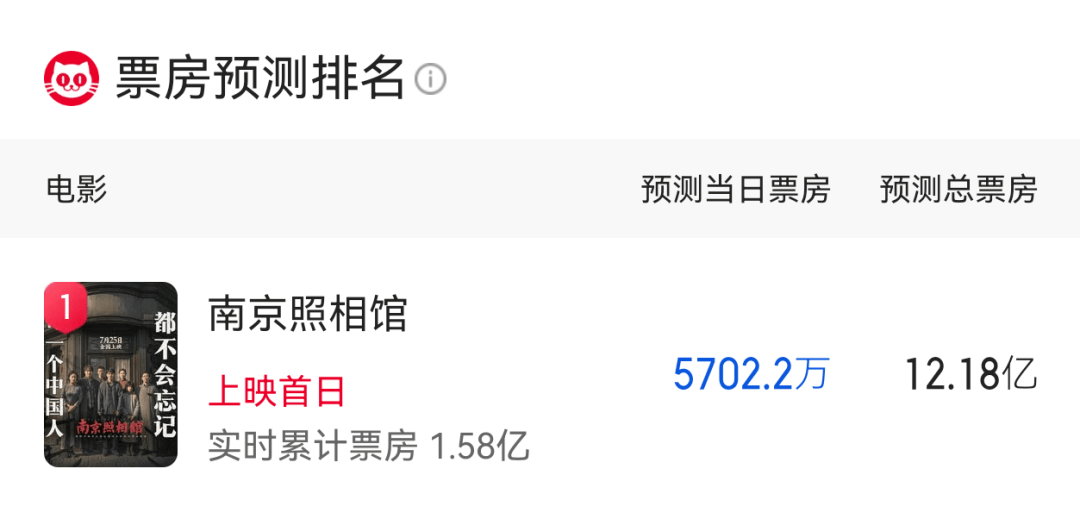 《南京照相馆》上映第一天即砍下了1.58亿票房,猫眼预测总票房剑指12亿,上映第二天单日票房预测破亿,总票房预测上涨直逼13亿,太难得了,可这是暑期档第一部总票房预测超10亿的影片啊!