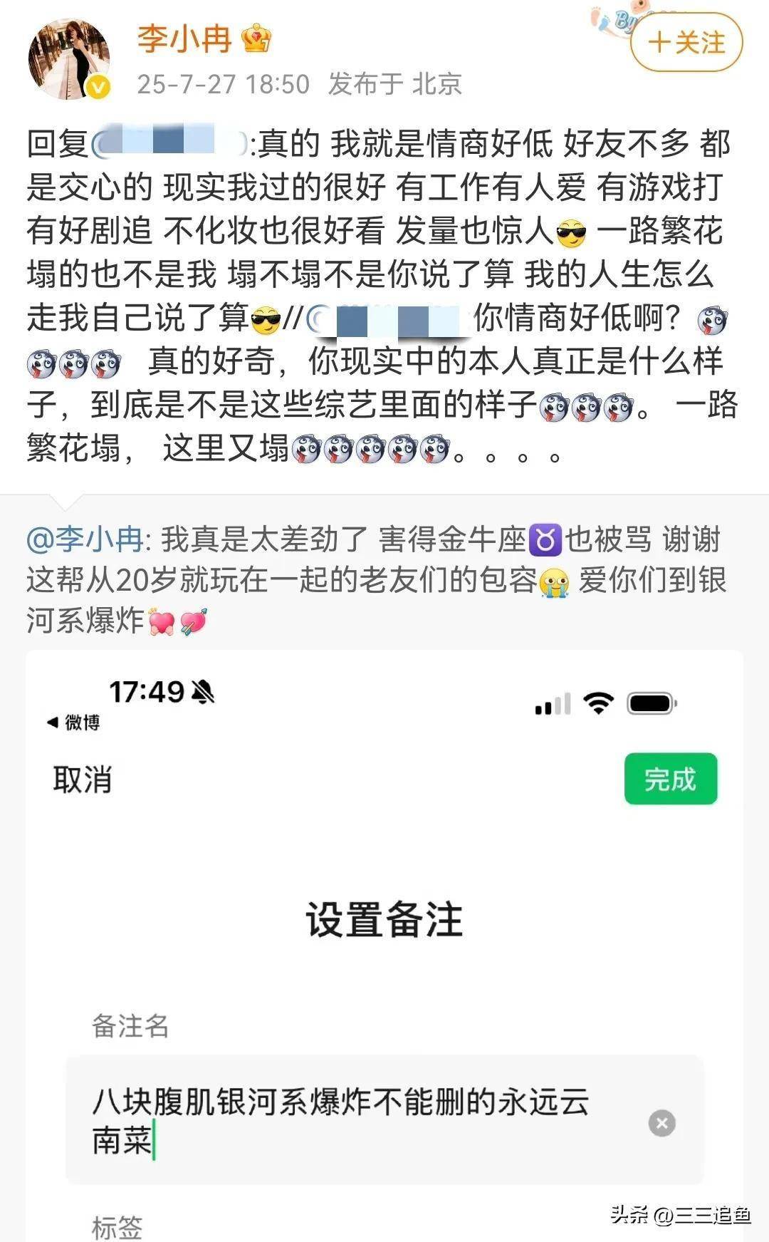 综艺结束后李小冉直接和网友对线,双方直接展开骂战,网友认为李小冉有些针对刘晓庆,李小冉对此反击,明显看出在向太的引领下,李小冉和刘晓庆的矛盾不可调和。