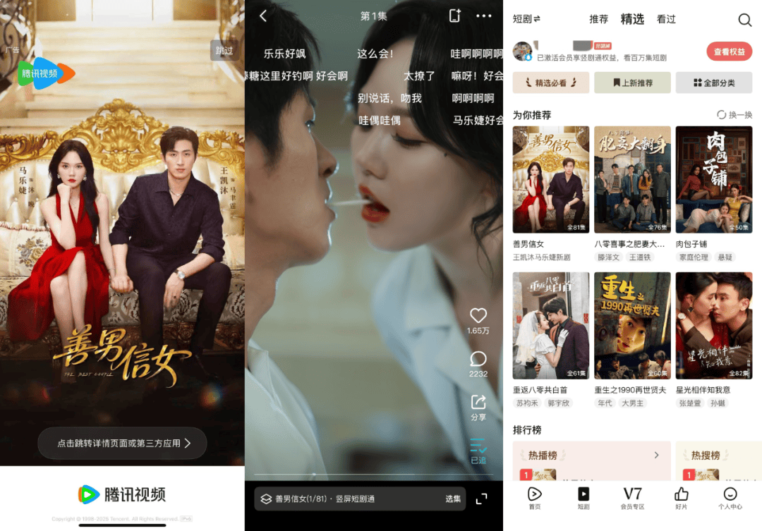腾讯视频还通过艺人直播+采访,打造了平台专属短剧热门CP,与用户实现强情感共振。《善男信女》CP霸榜,带动腾讯视频上这对CP主演的《爱不自知》《为你千千万万次》分别登上腾讯视频竖屏热搜榜TOP3、TOP4。