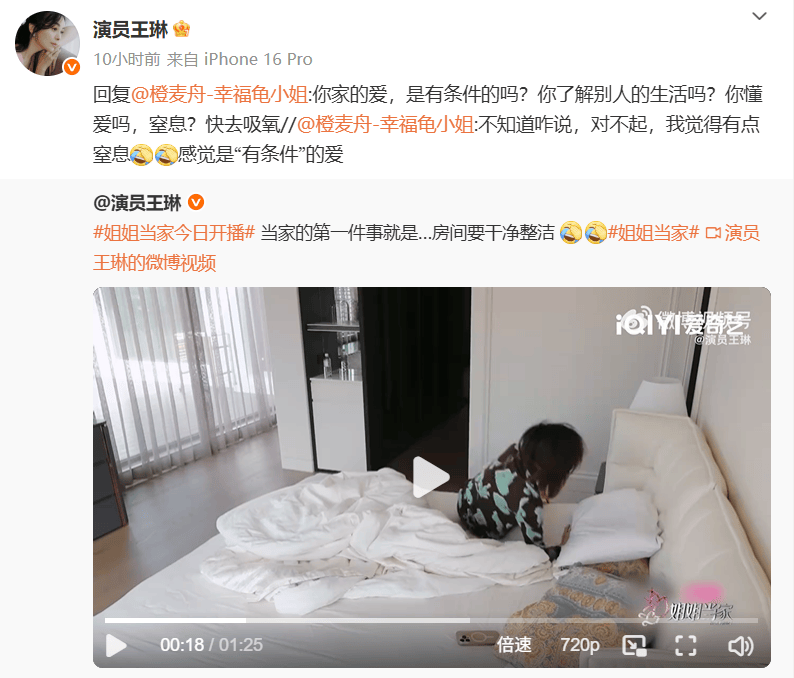 王琳随后转发该条评论并回怼:“你家的爱是有条件的吗?你了解别人的生活吗?你懂爱吗?窒息?快去吸氧。”