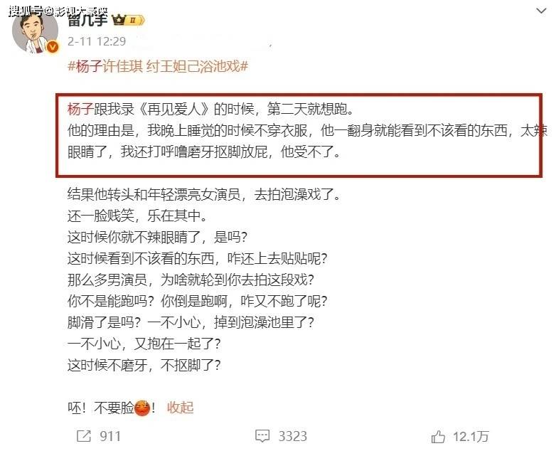 - 另一边杨子却画风跑偏:综艺里把方便面炸成黑炭、录《演员请就位》被批演技浮夸,浴池戏搭档女演员时连网红留几手都吐槽:“当初嫌我睡觉抠脚要退出节目,现在拍这个倒挺投入?”