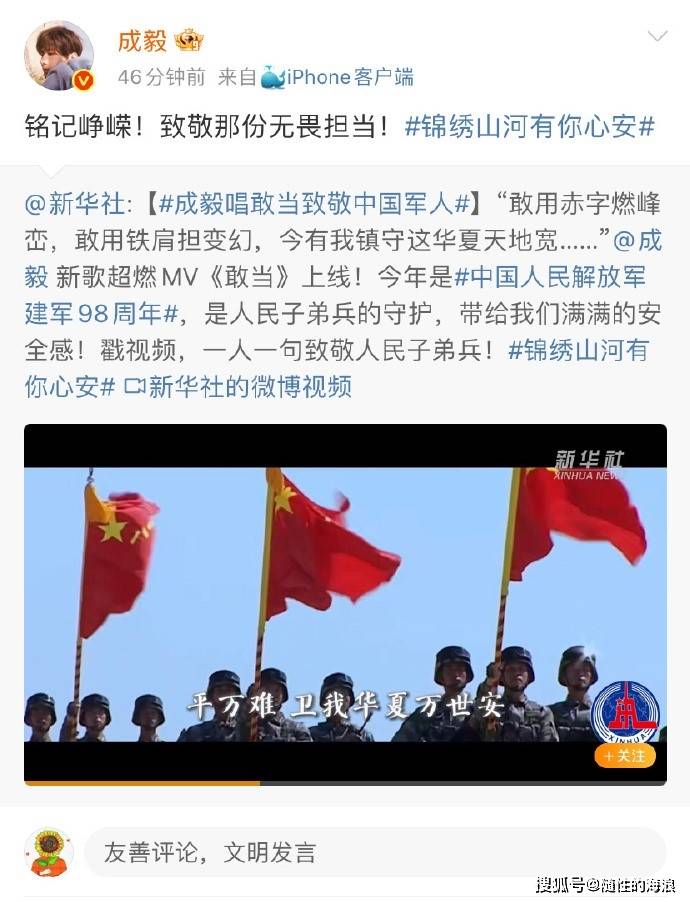 官媒的力挺,让这首歌曲的意义愈发凸显。它不仅是一首单曲,更像是一次跨越代际的精神对话,唤醒着每一位听众心中的家国担当。上线后,不少网友留言称,在成毅的歌声里感受到了历史的重量,也更懂得了如今安宁生活的来之不易。
