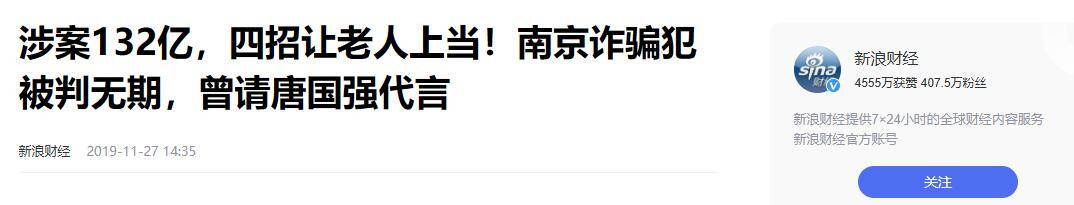 新浪财经《涉案132亿,四招让老人上当!南京诈骗犯被判无期,曾请唐国强代言》