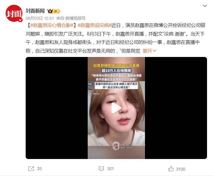 8月3日下午,赵露思突然开启直播,配文只有三个字:“没疯 谢谢”。镜头前的她语气平静,但话里话外全是暗流涌动。前一天,她刚在微博公开控诉经纪公司银河酷娱,直言“憋了太久的气和火,现在不想忍了”。直播中,她进一步解释:“发声明不是发疯,而是需要平等对话。”