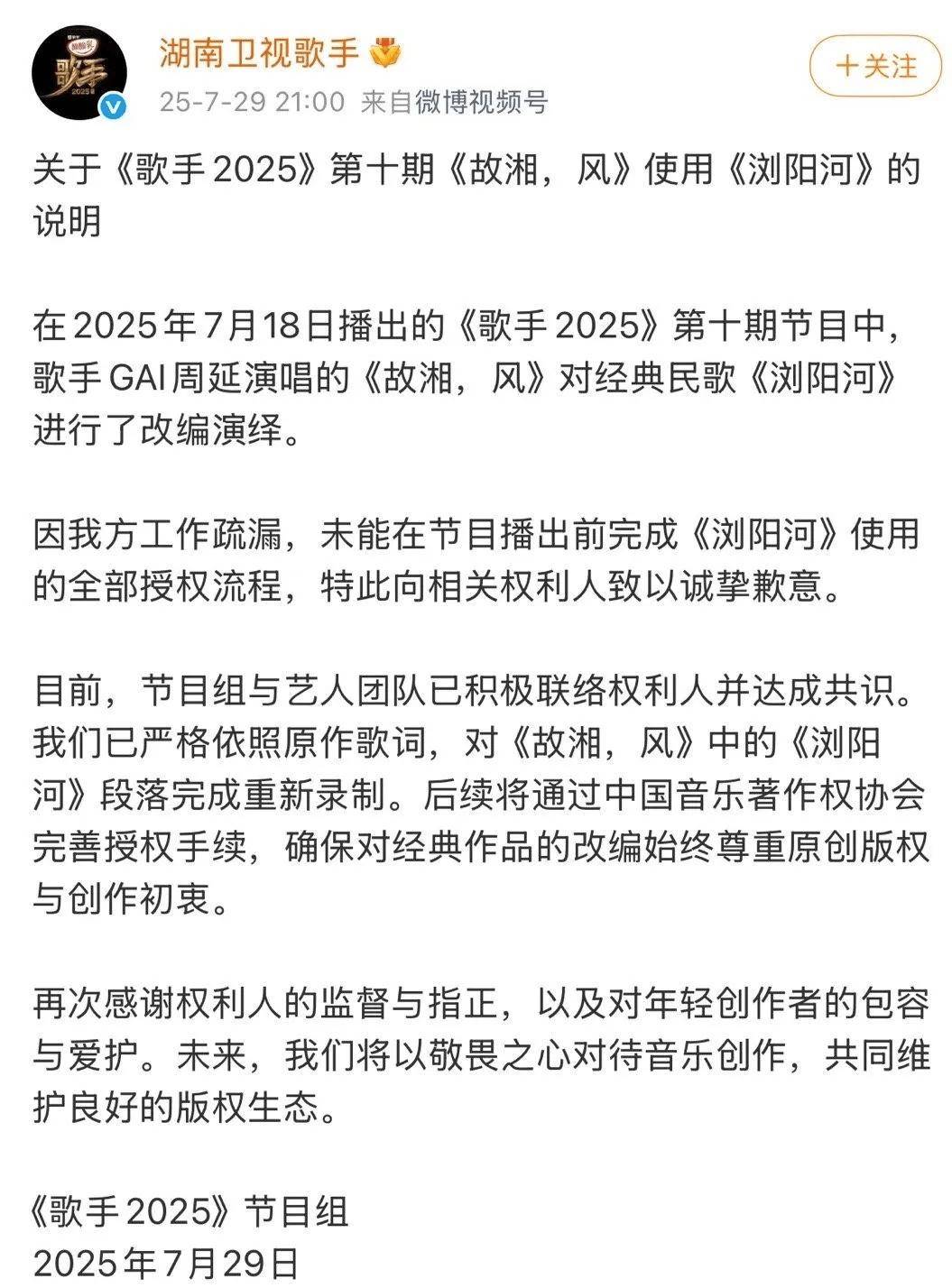 2.《歌手》公开道歉!GAI重新录制《浏阳河》!