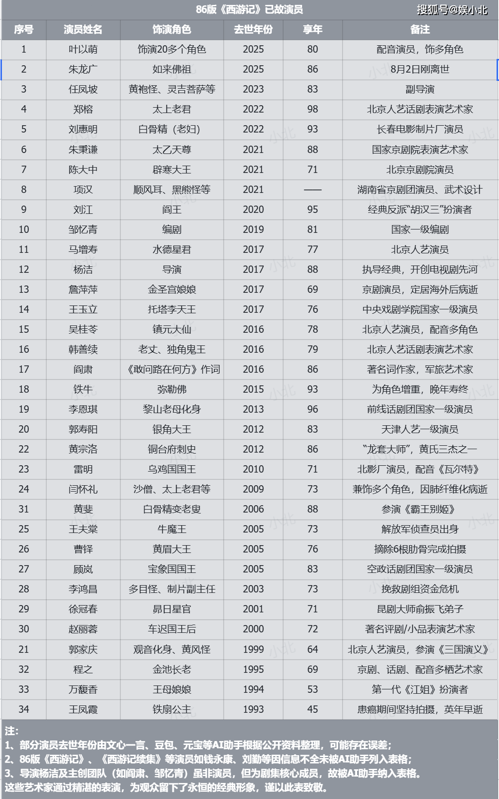 其实,在86版《西游记》播出的39年里,因病离世或是寿终正寝的演员就已经多达33位。