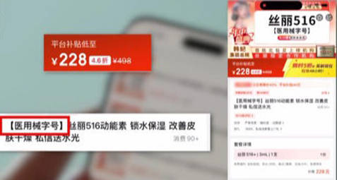广州市的广东韩妃整形外科医院,是一家持有《医疗机构执业许可证》的正规医美机构,院方在大众点评上,发布了一款售价仅为228元,明确标注“医用械字号”的“丝丽516动能素”水光产品。当记者进店咨询时,顾问强调,这款注射进皮肤的水光针剂,就是“械字号”。
