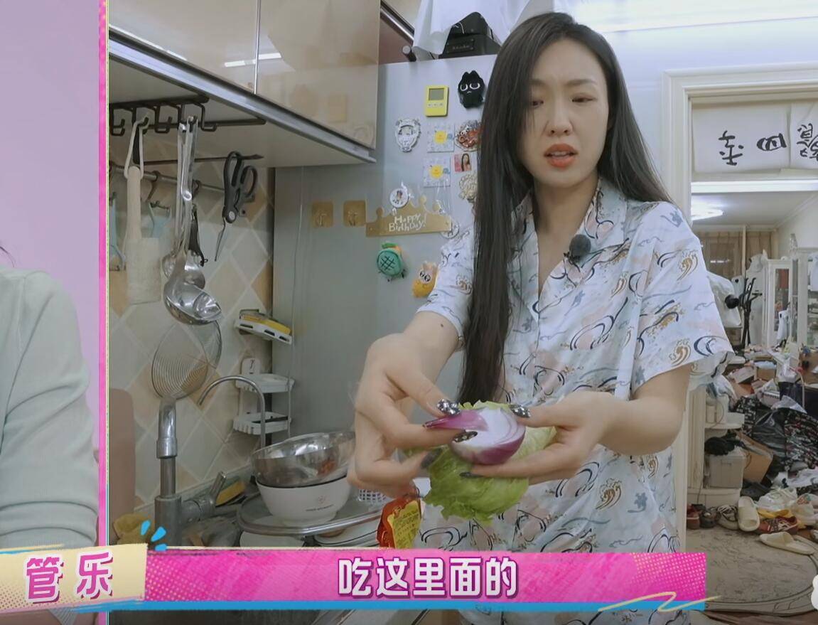 管乐找了一下,没找到盘子装洋葱,于是她就随手拿了一片生菜把洋葱包了起来,就这样塞进了嘴里。