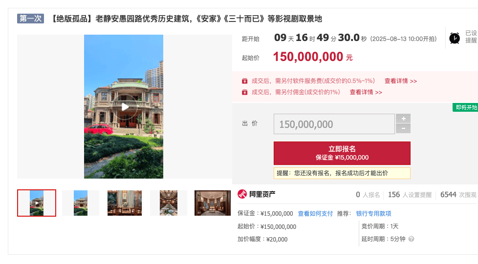 据阿里拍卖平台近日公告,曾作为《安家》《三十而已》等电视剧的取景地的上海一栋老洋房将在8月13日拍卖,起拍价1.5亿元。
