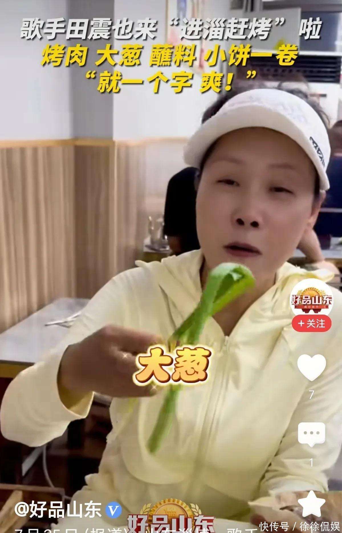 近日,田震在山东淄博的一家烧烤店现身,专程品尝当地著名的肉饼和腰子。她身穿黄色衣服,头戴帽子,显得十分低调。店员透露,她吃得非常开心,不停地赞叹食物的美味。