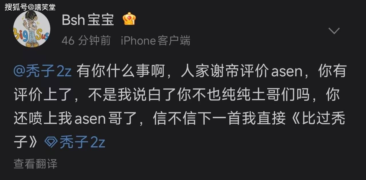“有你什么事啊,人家谢帝评价asen,你又评价上了,信不信下一首我直接《比过秃子》”