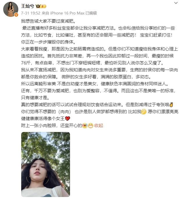 她说:“我从来不宣扬减肥,因为我知道肉肉对女生来说多重要,生病的时侯你的每一块肉都是你救命的保障。 微胖的女生多好看,满满的胶原蛋白,多幼态。所以远离畸形审美,不是白幼瘦才是美女,健康肤色丰满圆润的身材同样迷人。”