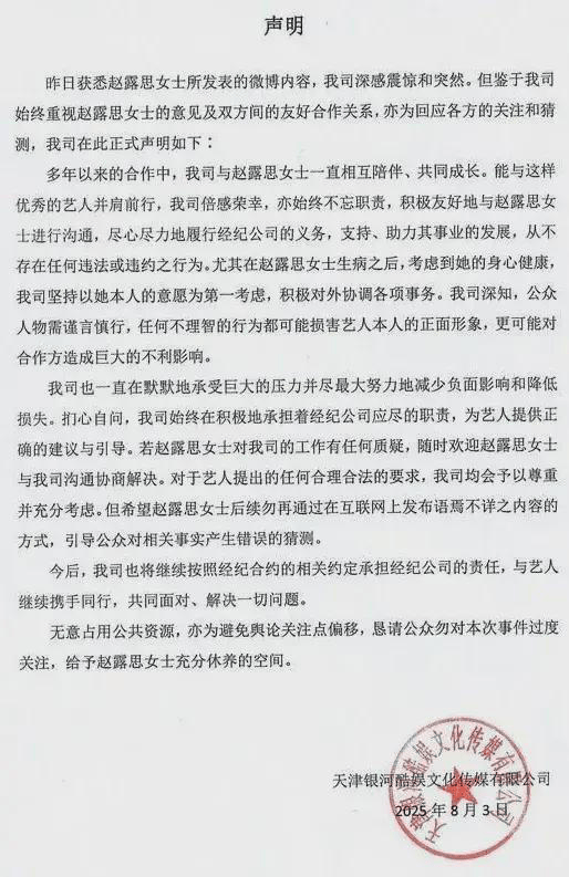7月8日,网友发现赵露思社交平台主页的“银河酷娱MCN”认证标识消失。上周六晚八点半,赵露思选择手撕自己的经纪公司银河酷娱,控诉公司“多宗罪”,未经协商划走工作室账户205万元赔偿代言损失、诱导签署分账单、工作室运营权归属、解约无果等。这新的一集堪称是年初生病停工、争议满天飞的个人定制综艺《小小的勇气》之后,顺理成章的续集。
