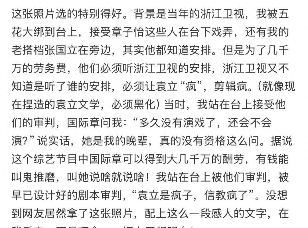 娱乐圈的风云变幻,似乎从未停歇,而每一场风暴过后,总有人悄然站出,试图揭开深藏在光鲜背后的黑暗。在这场名为“综艺”的盛宴中,我们常常看到舞台上的闪光与荣耀,却很少有人注意到舞台背后那些不可言说的秘密。最近,演员袁立的突如其来的炮轰,便成为了网络上热议的焦点,她直指浙江卫视综艺背后的“阴谋”,并称章子怡和张国立等人,联手将她推向了舆论的风口浪尖,将其塑造成“疯女人”的形象,究竟这一场娱乐圈的“剧本审判”背后,隐藏着怎样的真相呢?