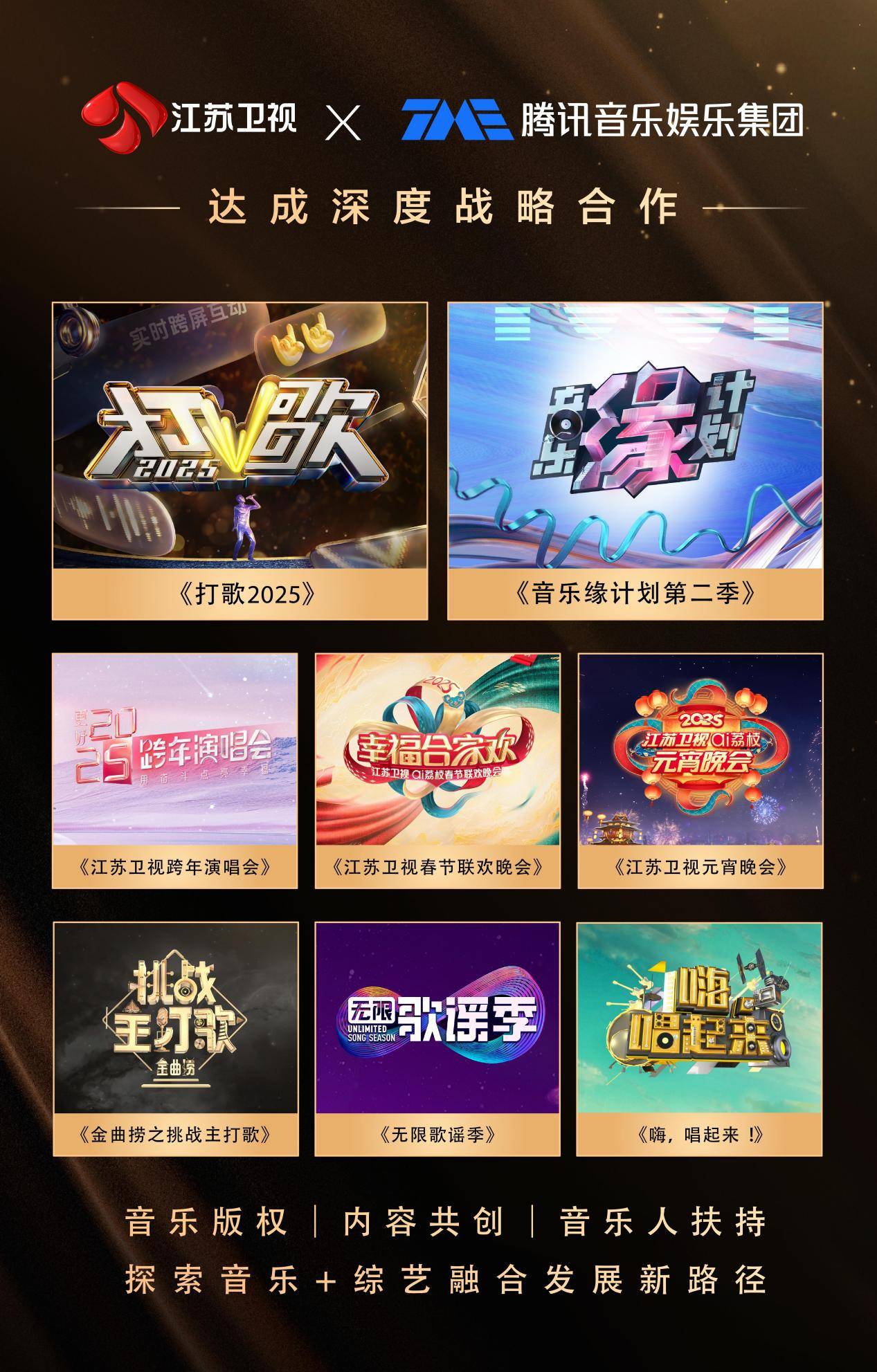 江苏卫视与腾讯音乐娱乐集团达成战略合作将聚焦音乐版权、内容共创、音乐人扶持三大板块。在音乐版权方面,双方将实现深度联动:江苏卫视2025年重点节目的音乐作品,包括《打歌2025》《音乐缘计划第二季》《江苏卫视跨年演唱会》《江苏卫视春节联欢晚会》《江苏卫视元宵晚会》等,将全面上线腾讯音乐旗下的QQ音乐、酷狗音乐、酷我音乐等平台。江苏卫视的经典音乐综艺IP,如《金曲捞》《无限歌谣季》《嗨,唱起来!》等节目的音乐作品也将持续在腾讯音乐平台呈现,节目中的优质歌曲将通过腾讯音乐的内容发行业务登陆海外音乐平台,让好音乐走向更广阔的世界;在内容共创方面,双方携手为综艺节目、晚会及各类活动打造专属主题曲与推广曲,推出更多深入人心的原创音乐作品;在音乐人扶持方面,依托《打歌2025》《音乐缘计划第二季》等王牌音乐综艺,以及腾讯音乐丰富的生态资源,双方将为潜力音乐人创造更多演出舞台和作品宣发机会,共同助力优秀音乐人成长。
