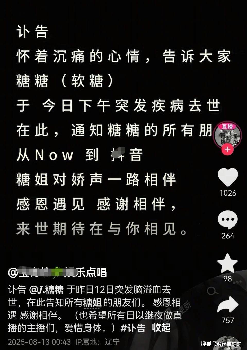8 月 13 日凌晨三点,网络世界尚未完全沉寂,一则突如其来的讣告却让无数网友心头一沉。辽宁当地知名声播机构 “娇声频道” 通过官方账号发布悼文,沉痛宣告旗下合作主播糖糖不幸离世的消息,字里行间满是惋惜与不舍。