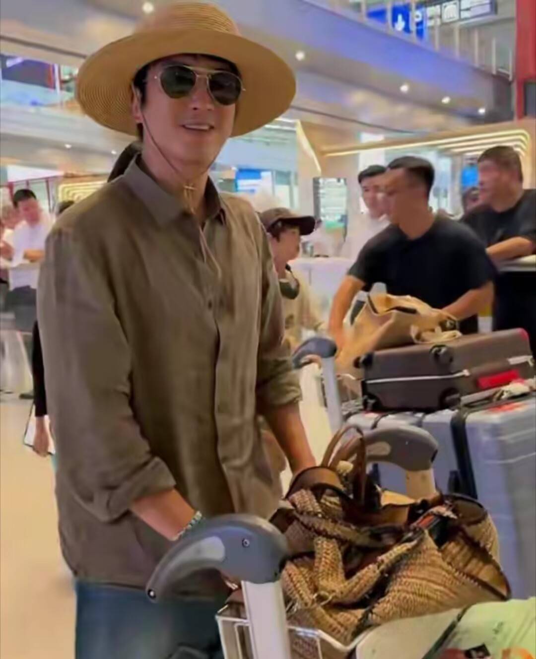 嗯哼一个人推三个行李箱。