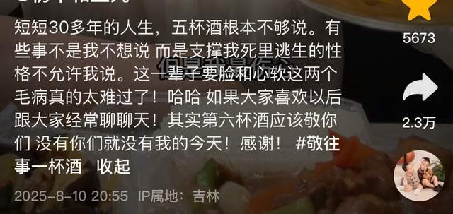 8月10号晚,网红耀杨在视频账号上分享了一段人生感慨:短短30多年的人生,五杯酒根本不够说,有些事不是我不想说,而是支撑我死里逃生的性格不允许我说,这一辈子要脸和心软这两个毛病真的太难了。
