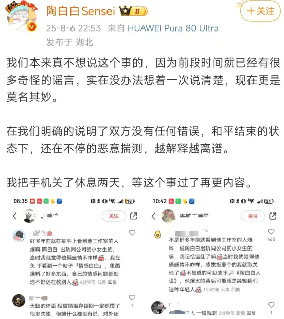 而陶白白在转发后的长文里,也对这段关系进行了反思,他坦率地承认,自己真的“从来都没有真正地去共鸣过她的情绪”。