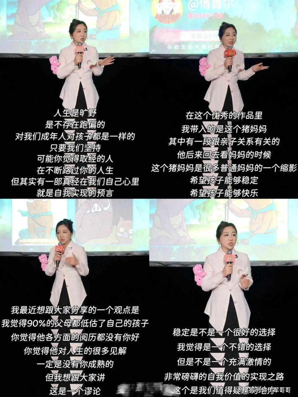 导演最初的想法很简单,希望拉近与女性观众的距离,引入所谓的 “她经济” 热议人物。傅首尔与苏敏阿姨先后站台,前者在公众心中的标签鲜明 —— 尖锐、犀利、带有争议;而后者的故事聚焦于家庭离异、自我追寻,被舆论热议。一次本来安静的合家欢动画宣传,变成了一场聚光灯下的 “拆家式” 现场。