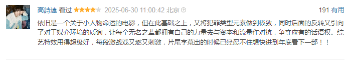 依旧是一个关于小人物命运的电影,但在此基础之上,又将犯罪类型元素做到极致,同时后面的反转又引向了对于媒介环境的质询,让每个无名之辈都拥有自己的力量去与资本和流量作对抗,争夺应有的话语权。综艺特效用得超级好,每段激战戏又燃又刺激,片尾字幕出的时候已经忍不住想快进到年底看下一部!!