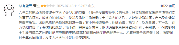 六年后的剧场版续集终于学会了类型片的节奏,但还是没掌握类型片的写法,导致观感依然像是三流玄幻文的章节合订本。最核心的问题之一便是反派比主角被动,干了票大的之后,人证物证都留痕,自己反而像是等着主角找。因此电影的两条线就非常干瘪:罗小黑那边就是,他逃她追,找到了,反派自曝,打一架,能力觉醒打赢了;会馆那边就是,找个借口把挂逼关家里,拖到结尾把再把挂壁放出来,全剧终。中间鹿野对于手段与结果之间的讨论与电影的主题/结尾的高潮关联度也是聊胜于无。矛盾解决全靠挂壁上线,深度探讨全靠台词输出,没实力不会写还是回去卖萌吧。