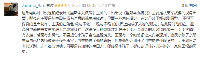这部电影可以说是和纪录片《里斯本丸沉没》互补的,如果说《里斯本丸沉没》主要是从英军战俘的视角出发,那么它主要是从中国东极岛渔民的视角来叙述,里面一些角色设定,在纪录片里能找到原型。 不得不说真的是大制作,主演们在角色“救与不救”、“跪与不跪”的抉择上完成了人物的弧光,与此同时他们在一些戏份里都是需要在水底下完成演绎的,这得多大的体能才能胜任!!不会游泳的人必须佩服一下!! 前面有多虐,后面有多解气。不要担心小孩子害怕血腥镜头。里面有一个细节很让人印象深刻,渔民小孩子亲眼看着自己的老师被鬼子残忍杀害,母亲捂住了他的眼睛,但是他努力掰开了母亲捂住他眼睛的手,用怒目给老师送别。这个细节说明,只要是有血性的中国人,即使是小孩子,都应该记住这血淋淋的、家仇国恨的历史。