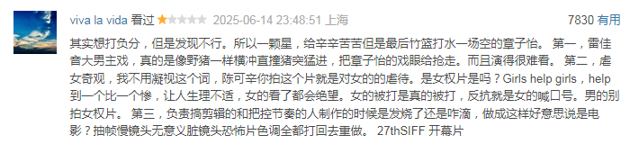 其实想打负分,但是发现不行。所以一颗星,给辛辛苦苦但是最后竹篮打水一场空的章子怡。 第一,雷佳音大男主戏,真的是像野猪一样横冲直撞猪突猛进,把章子怡的戏眼给抢走。而且演得很难看。 第二,虐女奇观,我不用凝视这个词,陈可辛你拍这个片就是对女的的虐待。是女权片是吗?Girls help girls,help到一个比一个惨,让人生理不适,女的看了都会绝望。女的被打是真的被打,反抗就是女的喊口号。男的别拍女权片。 第三,负责搞剪辑的和把控节奏的人制作的时候是发烧了还是咋滴,做成这样好意思说是电影?抽帧慢镜头无意义脏镜头恐怖片色调全都打回去重做。