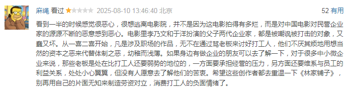 看到一半的时候感觉很恶心,很想逃离电影院,并不是因为这电影拍得有多烂,而是对中国电影对民营企业家的源源不断的恶意感到恶心。电影里李乃文和于洋扮演的父子两代企业家,都是被嘲讽被打击的对象,又蠢又坏。从一喜二喜开始,凡是涉及职场的作品,无不在通过骂老板来讨好打工人,他们不厌其烦地用想当然的资本之恶来代替体制之恶,幼稚而浅薄。如果身边有做企业的朋友可以去了解一下,对于很多中小微企业来说,那些老板是处在比打工人还要弱势的地位的,一方面要承担经营的压力,另方面还要维系与员工的利益关系,处处小心翼翼,但没有人愿意去了解他们的苦衷。希望这些创作者都去重温一下《林家铺子》,别再用自己的片面无知来制造劳资对立,消费打工人的负面情绪了。
