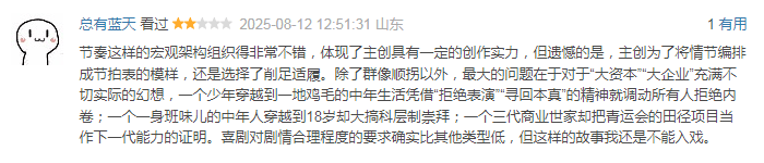 节奏这样的宏观架构组织得非常不错,体现了主创具有一定的创作实力,但遗憾的是,主创为了将情节编排成节拍表的模样,还是选择了削足适履。除了群像顺拐以外,最大的问题在于对于“大资本”“大企业”充满不切实际的幻想,一个少年穿越到一地鸡毛的中年生活凭借“拒绝表演”“寻回本真”的精神就调动所有人拒绝内卷;一个一身班味儿的中年人穿越到18岁却大搞科层制崇拜;一个三代商业世家却把青运会的田径项目当作下一代能力的证明。喜剧对剧情合理程度的要求确实比其他类型低,但这样的故事我还是不能入戏。