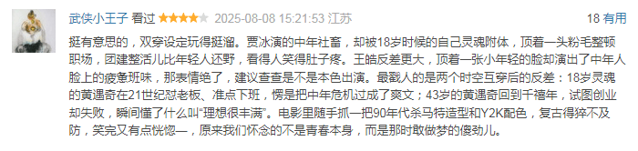 挺有意思的,双穿设定玩得挺溜。贾冰演的中年社畜,却被18岁时候的自己灵魂附体,顶着一头粉毛整顿职场,团建整活儿比年轻人还野,看得人笑得肚子疼。王皓反差更大,顶着一张小年轻的脸却演出了中年人脸上的疲惫班味,那表情绝了,建议查查是不是本色出演。最戳人的是两个时空互穿后的反差:18岁灵魂的黄遇奇在21世纪怼老板、准点下班,愣是把中年危机过成了爽文;43岁的黄遇奇回到千禧年,试图创业却失败,瞬间懂了什么叫“理想很丰满”。电影里随手抓一把90年代杀马特造型和Y2K配色,复古得猝不及防,笑完又有点恍惚—,原来我们怀念的不是青春本身,而是那时敢做梦的傻劲儿。