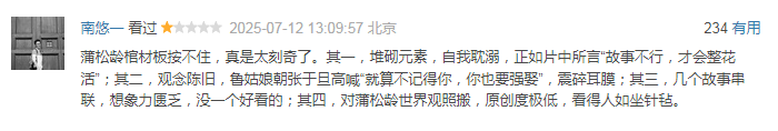 蒲松龄棺材板按不住,真是太刻奇了。其一,堆砌元素,自我耽溺,正如片中所言“故事不行,才会整花活”;其二,观念陈旧,鲁姑娘朝张于旦高喊“就算不记得你,你也要强娶”,震碎耳膜;其三,几个故事串联,想象力匮乏,没一个好看的;其四,对蒲松龄世界观照搬,原创度极低,看得人如坐针毡。