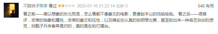 小结:还是姜文那股味儿,依然是他擅长的幽默、戏谑、天马行空,以及各种肉眼可见的隐喻。这些都好,就是不对。用在郎朗的半传记片上不对、用在高举高打女性主义的当下不对、用在嫌弃爹味的语境下更不对。种种迹象表明,姜文的那一套,过时了。
