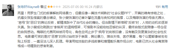 小结:剧本不扎实、情绪化表达太多,以及对霸凌女性的直观呈现败光了这部电影的好感,也再一次证明堆砌明星不是助推票房的灵丹妙药。
