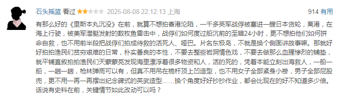 有那么好的《里斯本丸沉没》在前,就算不想拍香港沦陷,一千多英军战俘被塞进一艘日本货轮,离港,在海上行驶,被美军潜艇发射的数枚鱼雷击中,战俘们如何度过船沉前的至暗24小时,更不想拍他们如何拼命自救,也不用前半段把战俘们拍成待救的活死人、哑巴。片名东极岛,不就是换个侧面讲故事嘛。那就好好拍拍渔民们贫穷艰难的日常,朴实善良的本性,不要去整些岩洞情色戏,不要去做那么血腥惨烈的铺垫,就平铺直叙拍拍渔民们天蒙蒙亮发现海里漂浮着很多物资和人,活的死的,凭着本能立刻出海救人,一船一船,一趟一趟,枪林弹雨可以有,但真不用吊在桅杆顶上凹造型,也不用女子全部紧身小褂,男子全部屁股兜,更不用一再一再摆出纪念碑式的英武造型……换个角度好好抄抄作业,都会比现在的好不知道多少倍。话说有史料在前,关键情节如此改动可以吗?
