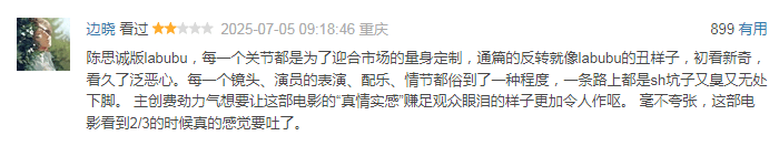 陈思诚版labubu,每一个关节都是为了迎合市场的量身定制,通篇的反转就像labubu的丑样子,初看新奇,看久了泛恶心。每一个镜头、演员的表演、配乐、情节都俗到了一种程度,一条路上都是sh坑子又臭又无处下脚。 主创费劲力气想要让这部电影的“真情实感”赚足观众眼泪的样子更加令人作呕。 毫不夸张,这部电影看到2/3的时候真的感觉要吐了。