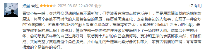 看完心头一暖,穿越互换灵魂的桥段不算新鲜,但导演没有将重点放在反差上,而是用温情细腻的笔触施散魔法:将两个身处不同时代的人带着各自的夙愿,经历着周遭变化,改变着身边的人和事,实现了一种奇妙的“双向奔赴”。将喜剧包袱巧妙的融入故事点滴角落,捧腹爆笑之余,又能感知到同样生活压力的心酸。老黄在敬老院的最后招手很催泪,情感在那一刻仿佛屏住呼吸又安静的下了一场倾盆大雨。结尾部分主题升华,会幻想到多年后的自己过得好吗,联想到十八岁的自己会后悔吗。贾冰和王皓的表演都很自然,相辅相成、共同完整了黄遇奇这个角色弧光。片中运用的千禧年元素好像将我带入一家复古装潢的店铺,零零落落摆放的全是曾经的美好。