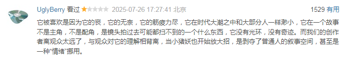 它被喜欢是因为它的丧,它的无奈,它的筋疲力尽,它在时代大潮之中和大部分人一样渺小,它在一个故事不是主角,不是配角,是镜头拍过去可能都扫不到的一个什么东西,它没有光环,没有奇迹。而我们的创作者离观众太远了,与观众对它的理解相背离,当小猪妖也开始放大招,是剥夺了普通人的叙事空间,甚至是一种“情绪”挪用。