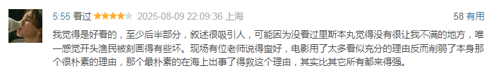 很难不和《里斯本丸沉没》进行比较。我喜欢这个真实故事,其中最重要的一个原因是中国渔民救英俘完全出于一种纯粹的人道主义精神,没有任何芥蒂或界限,就像后面采访说的“人遇难了就得救,不管是哪个国家”。但电影中对这种救人的矛盾化复杂化,让我觉得制作组似乎并不相信这种纯粹的人道主义精神是真正存在的,因此这种戏剧性的画蛇添足,在我看来就是一次彻头彻尾的失败改编。从另一个角度想,可能这种精神在当下早已是一种失传的美德吧。