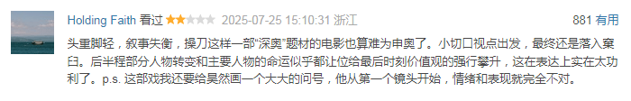小结:《恶意》是明显的“偏科生”,过分追求桥段打磨、悬疑感的营造以及热点话题的契合,结果反而显得过于刻意,视听语言俗气、制作水准难称精良,注定换不来好口碑。