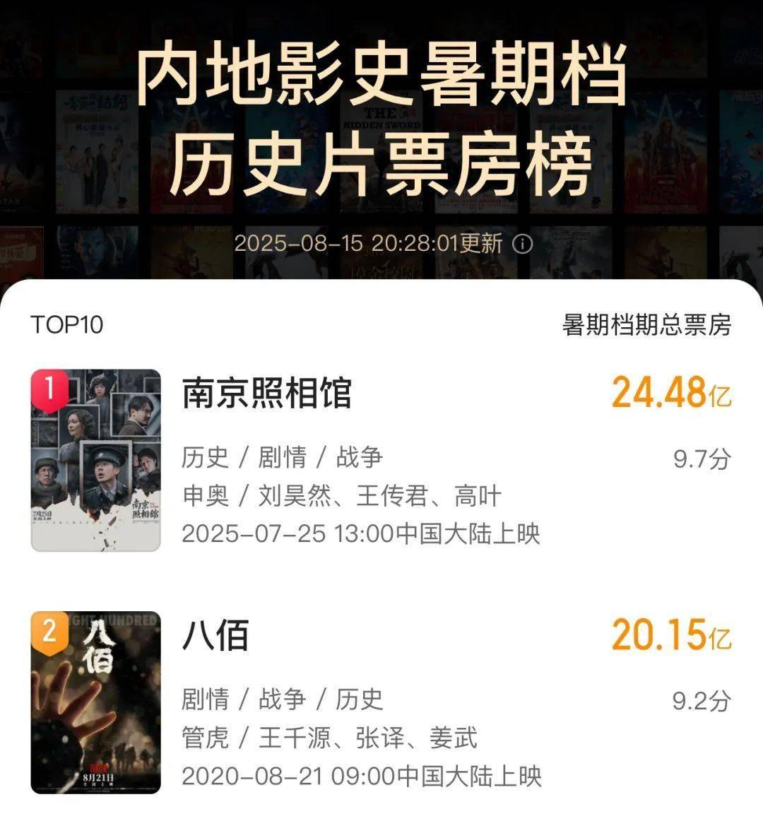 申奥执导的《南京照相馆》凭借强劲的票房⾛势脱颖而出,成为了这个夏天电影市场的最⼤亮点。截至发稿,该片暑期档期票房突破24亿元,已经超越此前由《⼋佰》保持的20.15亿票房成绩,刷新了内地影史暑期档历史片票房纪录。