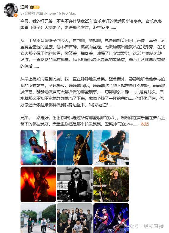 “今晨,我的好兄弟、不离不弃伴随我25年音乐生涯的优秀贝斯演奏家、音乐家韦国勇(伢子)因病走了,走得那么突然,终年52岁……”8月15日,汪峰在微博中发出长文。
