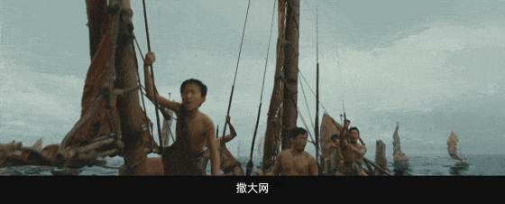 阿花率众渔民驾驶几十艘木帆船赶到,是本片最震撼的画面。