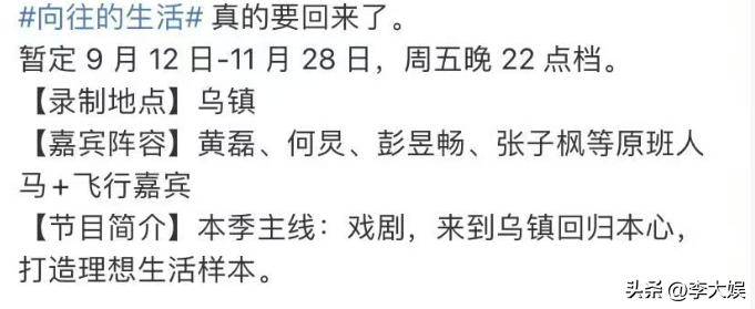 《向往的生活》第八季的回归已基本确定,节目招商已经结束,录制将于本月启动,预计将在九月下旬与观众见面。从前七季的录制地来看,北京密云、浙江桐庐、湖南常德等地的自然风光为节目增色不少,每个地点的选择都为节目的基调奠定了基础。而这一次,第八季的录制地搬到了戏剧节举办地——乌镇,且节目内容和常驻嘉宾阵容都有了大幅调整。此次变革带来新意的同时,也存在一定的风险,若稍有不慎,可能会受到观众的批评。