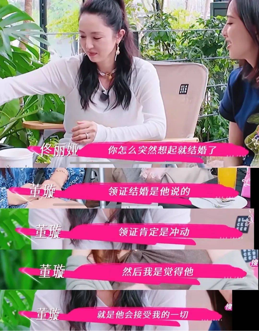上个月,董璇在新综艺看片会上谈及“再婚”,她说选择再次走入婚姻的决定影响了自己的很多姐妹,特别是好姐妹佟丽娅 ,“本来已经水泥封心,现在又相信爱情了。”