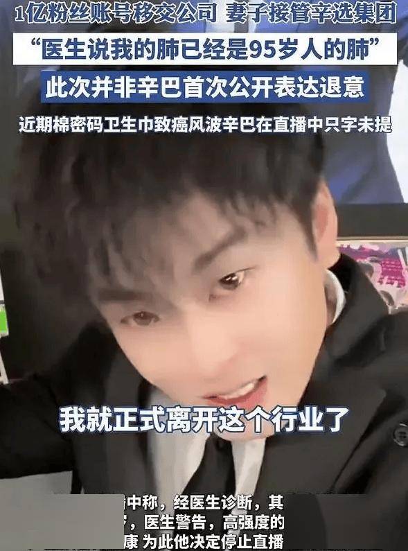 “跟大家做个告别,从今天开始辛巴再无能力承载直播这份工作,正式宣布退出直播行业。”8 月 18 日晚,辛巴在直播中再次宣言退网,主要原因是其肺部出现了严重的疾病,“你可以理解为就是慢性癌症,医生说我的肺已经是 95 岁人的肺。”