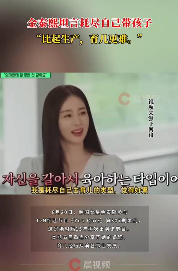 金泰熙在节目中坦言“我是耗尽自己去育儿的类型,我觉得好累”以及“比起生产,育儿更难”。