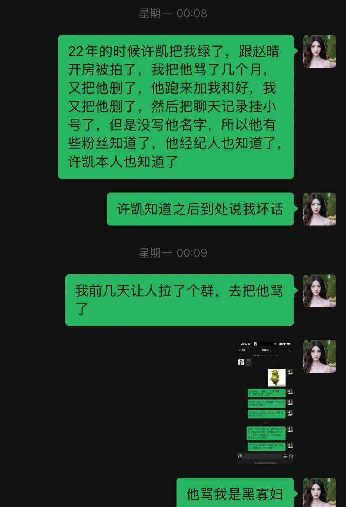 而许凯说她坏话的原因也很简单,女方称许凯认为她把聊天记录发到微博是故意害他,心机重。尴尬的是许凯对这段关系的定义在朋友口中也不一样,女方称2022年许凯要官宣她,许凯说坏话的时候则不承认恋情,否认拍拖,只是睡过几次。